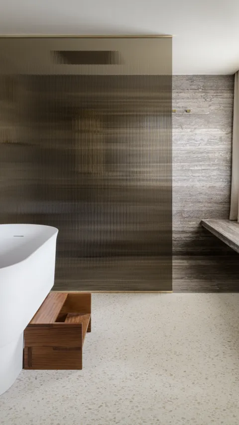 Klare Linien und Geometrien in den Bädern: Auch die Bäder zeichnen sich durch Offenheit und Reduktion aus: Klare Linien und Geometrien prägen die Räume, genau wie die großzügige Verwendung von Naturstein und dunklem Glas. Dornbrachts Designklassiker TARA führt diese Ästhetik konsequent fort: Mit ihrer archetypischen Form steht die Armatur in perfektem Einklang mit ihrer Umgebung, harmoniert mal mit gemasertem Naturstein, mal mit quadratischen Aufsatzbecken. Die Oberflächen in Messing gebürstet (23kt Gold) unterstreichen darüber hinaus die subtile Eleganz der unterschiedlichen Badarchitekturen – und tragen dazu bei, die Bäder zu exquisiten Rückzugsorten zu machen.