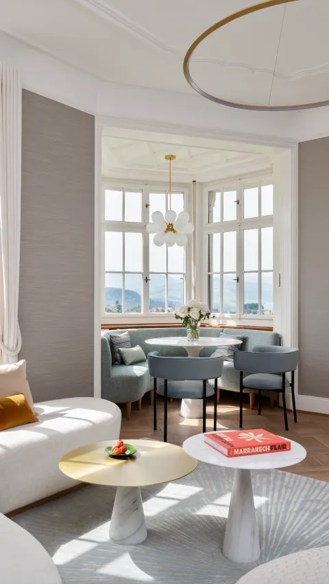 Ein Großteil der Räume ist geprägt von hellen Grau-, Cremeund Beigetönen, versetzt mit sanften, grünen Akzenten. Die organische Farbpalette verleiht dem klassischen Interieur Leichtigkeit. Darüber hinaus setzen moderne Designelemente gezielte Kontraste. In der großzügigen Küche sorgt eine maßgefertigte Sitzecke für Gemütlichkeit. Ebenso einladend: Die Bar mit ihrer kunstvollen Holzvertäfelung.