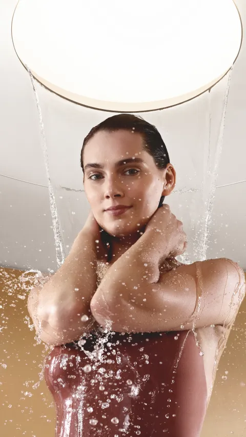 AQUACIRCLE features a funnel effect, created by varying water flow and volume as water falls from the dome. The more water, the smaller the funnel becomes. Reduced water flow increases the size of the funnel, and the water falls down around the head and evenly onto the shoulders, like a rain curtain. With this feature, AQUACIRCLE creates a relaxing and meditative feeling.