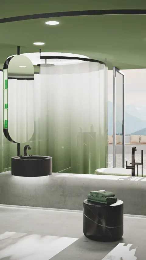 Recycled, green glass brings a subtle sheen and glamour to the bathroom, creating atmosphere and evoking associations with nature.