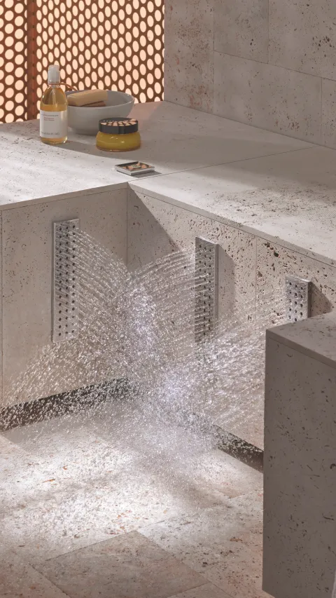 De beendouche heeft vier WATER BARS, die op onderbeenhoogte in de douche zijn geïnstalleerd. Hij kan worden bediend met de handige Dornbracht xTOOL, waarmee de temperatuur en het watervolume zeer nauwkeurig kunnen worden geregeld. |