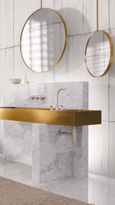 Marmer en beton, messing en hout, natuurlijk licht en Platina geborsteld. De traditionele Aziatische invloeden zijn hier net zo duidelijk aanwezig als de drang om iets nieuws te creëren. Een vooruitstrevende en toch helende balans. Het idee van Transitional Style leidt tot een meditatie over ruimte, textuur en (badkamer)cultuur in de 21e eeuw.